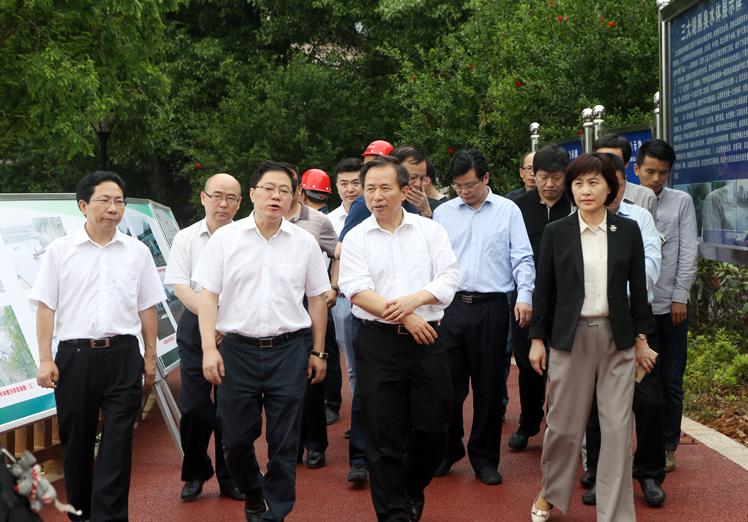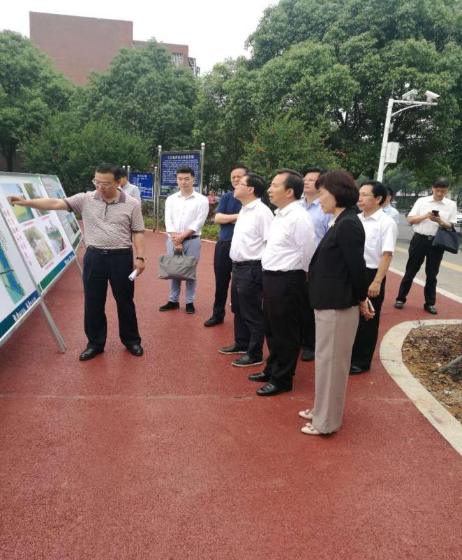 在项目现场,李干杰听取了我司有关黑臭水治理工程定位和实施进展情况汇报,并详细询问了黑臭水体治理现状。他强调,蛇皮套和三大湖综合整治项目是岳阳市海绵城市之中心城区湖泊河道综合整治的重头,要通过黑臭水体治理,带动污水处理设施的提质改造和升级换代,以实现标本兼治的根本目的。该项目通过退养规划、生态清淤、活水连通、生态浮岛、曝气复氧、水生植物等达到净化水质,改善环境的目的,实现黑臭水体治理效果的方式,值得推荐。