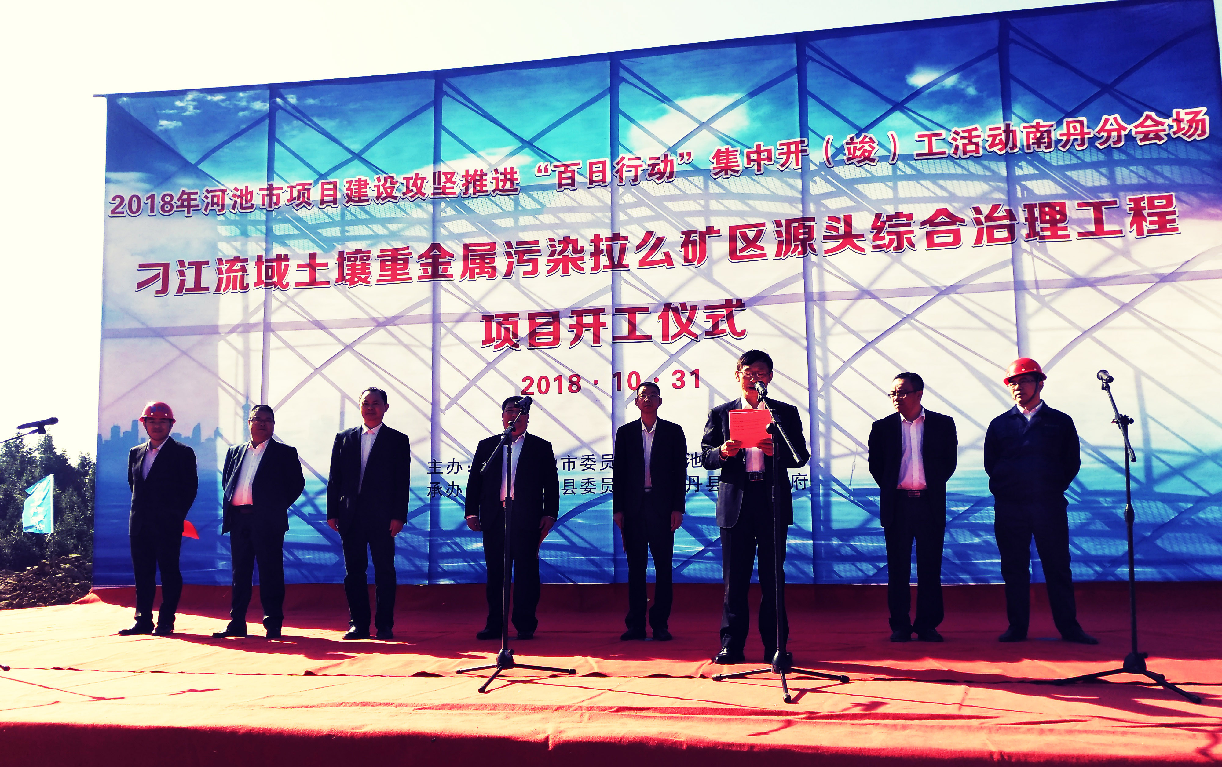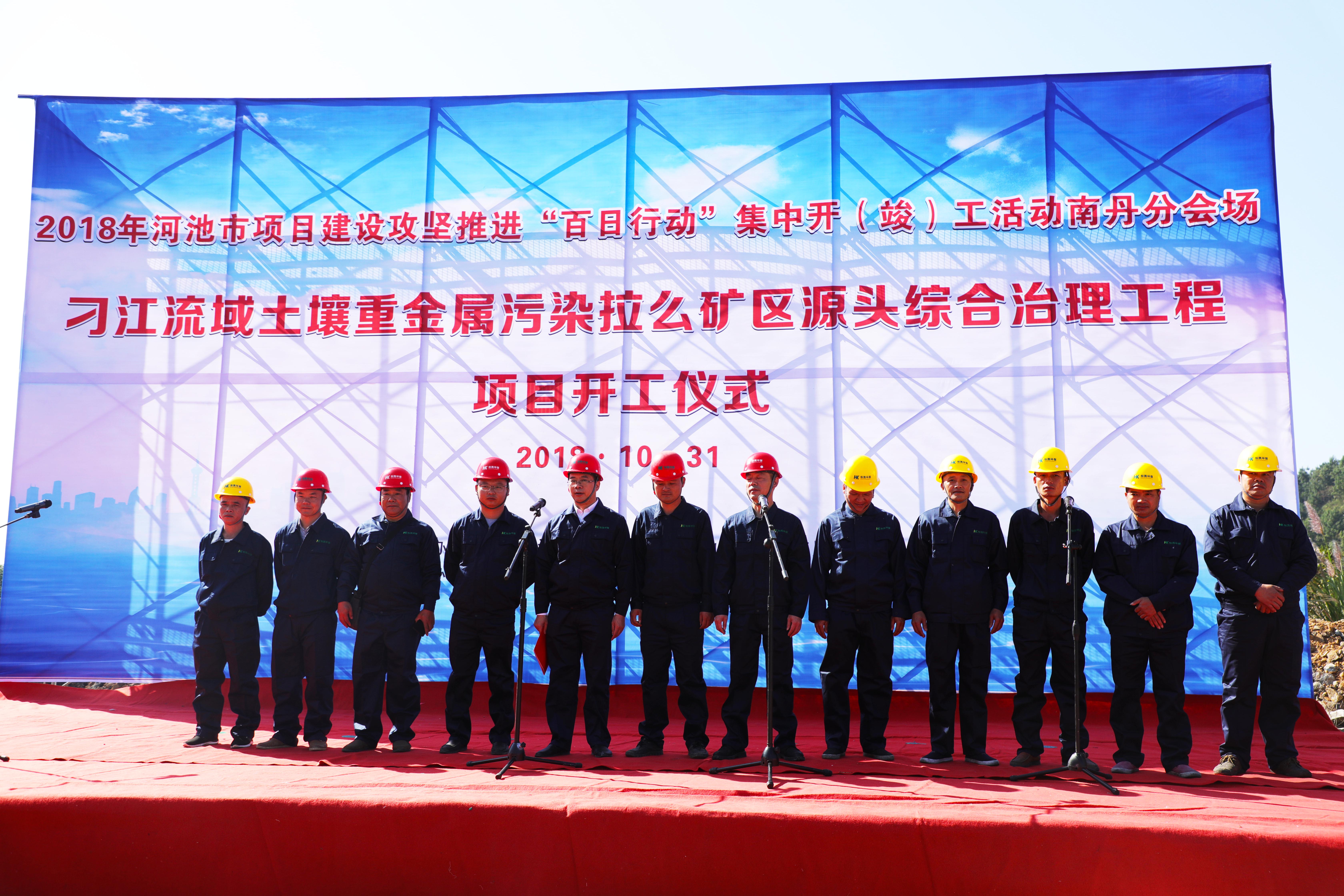 10月31日,秋高气爽,晴空万里,湖南乐虎lehu国际官网环保集团承建的广西南丹刁江流域土壤重金属污染拉么矿区源头综合治理工程(2标段)喜迎开工,刁江项目部全体参建人员着装整齐、意气风发地参加了项目开工庆典。南丹县政协主席梁瀚文、县委副书记莫晓明、政法委书记黄幸乐、人大副主任缪芝龙、政协副主席莫少敏、环保局副局长李方、湖南乐虎lehu国际官网环保集团领导莫唐文一同出席了开工典礼。