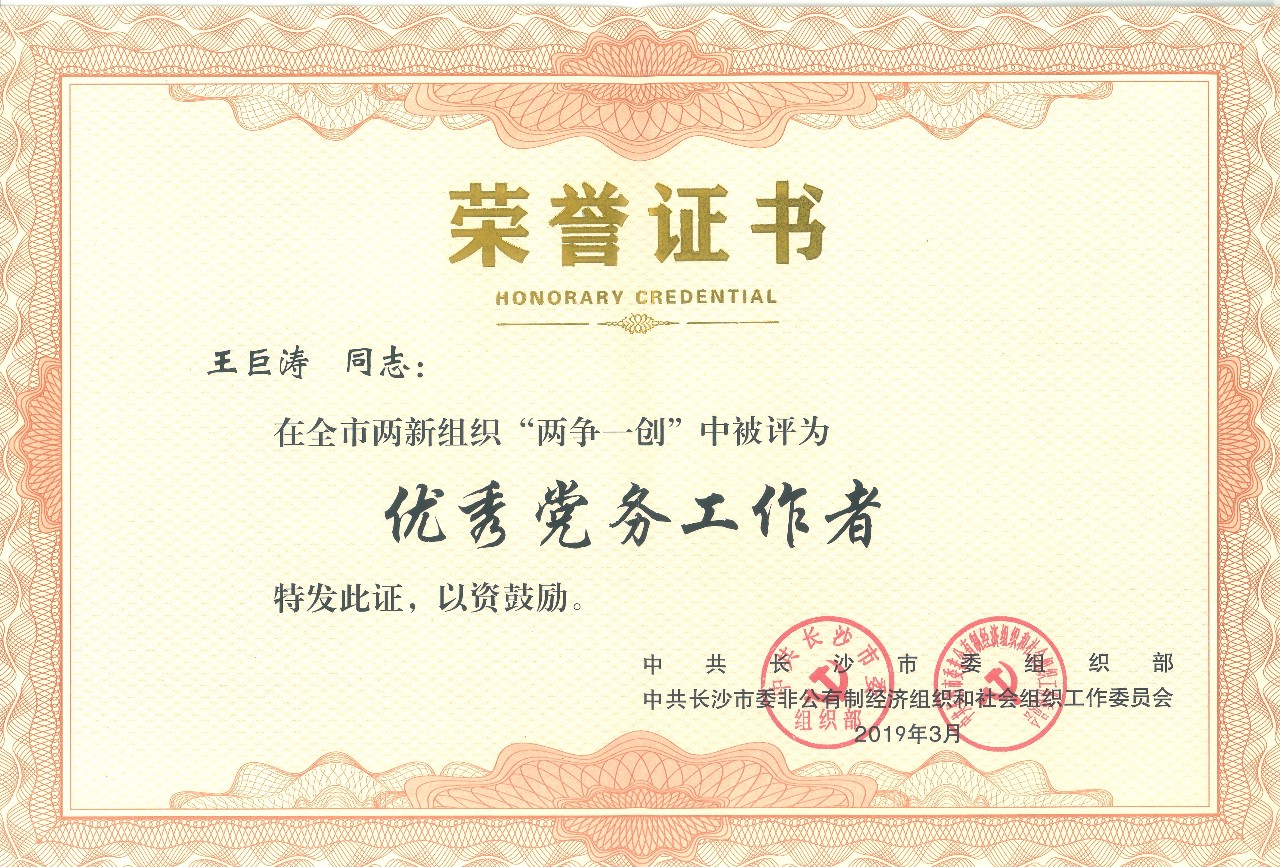 日前,长沙市委组织部与市委非公有制经济组织和社会组织工作委员会对全市两新组织“两争一创”先进典型进行通报表彰,集团党委书记王巨涛同志被评为优秀党务工作者,这不仅是对王巨涛同志的嘉奖和肯定,也是对集团党建工作的鼓励和鞭策。